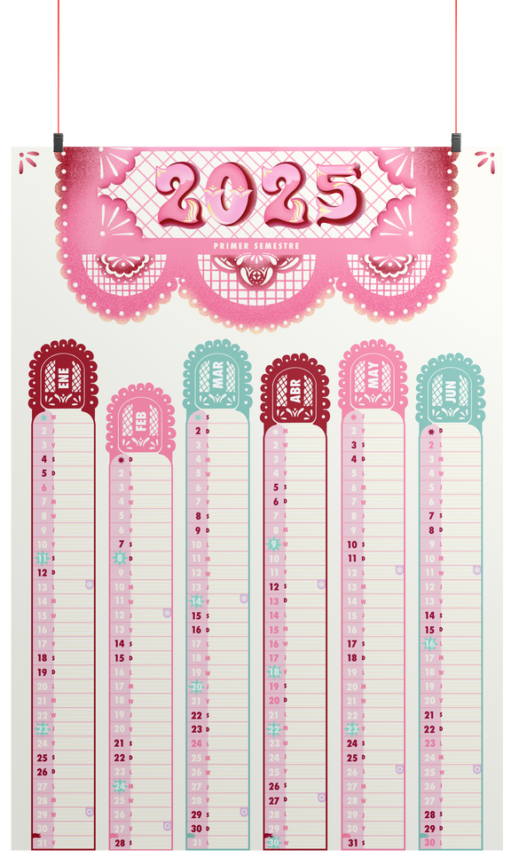 Calendarios semestrales del 2025, inspirado en los papeles picados mexicanos. Tienes marcadas fechas especiales, como lo son los festivos y dos fases de la luna (llena y nueva), y además, como es un proyecto personal, también tiene señalado los cumpleaños.